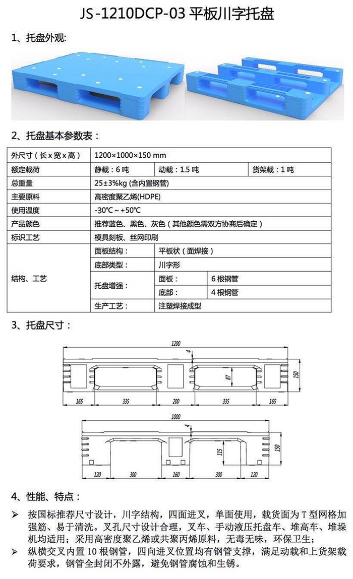 3、塑料托盤(pán)的適應(yīng)環(huán)境溫度:-25℃-80℃(盡量避免陽(yáng)光爆曬及靠近熱源)。